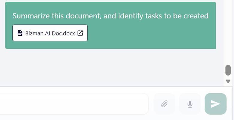 The Bizman AI Assistant represents a key step toward intelligent, workflow-driven automation within the platform. It combines conversational input with direct task execution, positioning it as a core productivity tool for teams.