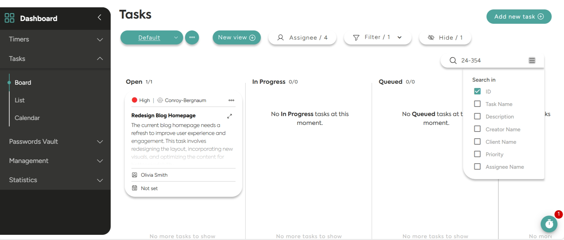 With our intuitive task tracking system, finding specific tasks is a breeze. Utilize our robust search feature to locate tasks using keywords within task titles and comments or by entering the task ID# that includes the last two digits of the year the task was created for more context. This ensures you can quickly access the information you need, saving time and effort.