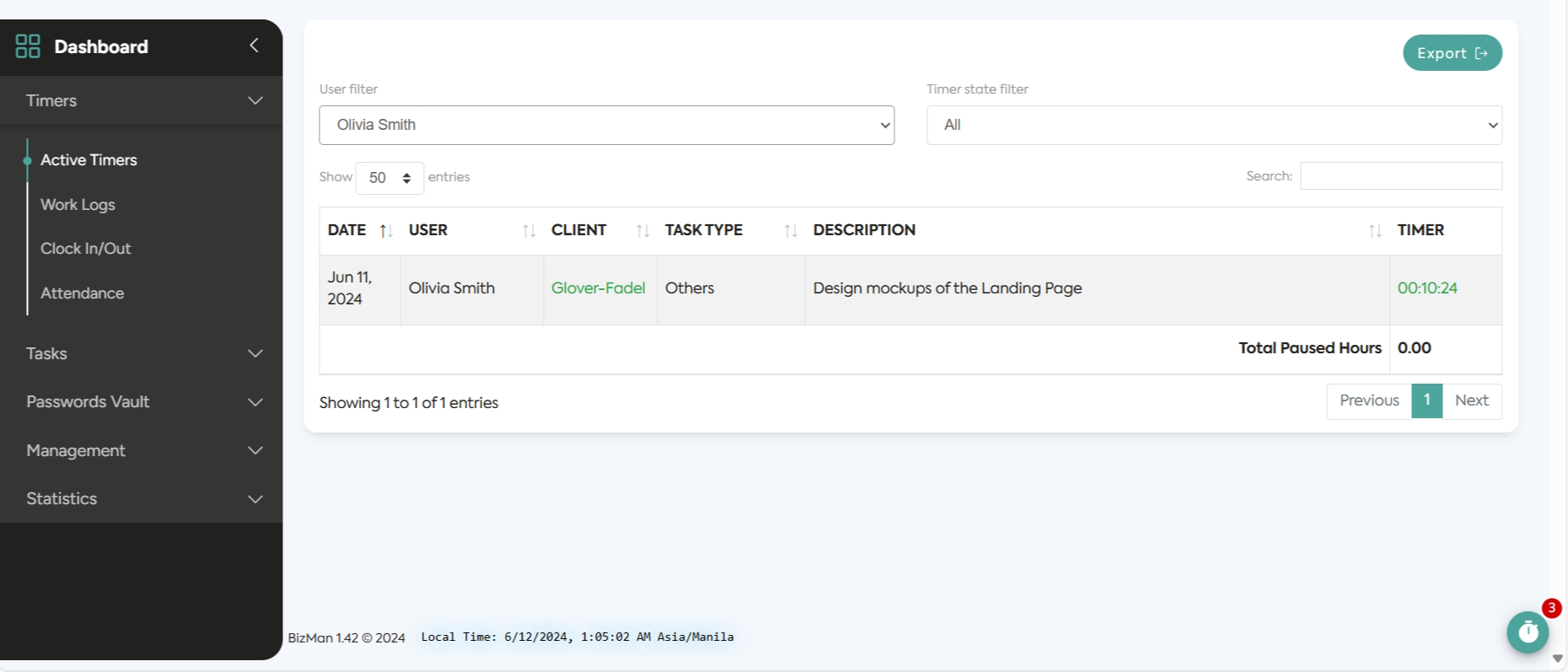 Bizman Time-tracking is a comprehensive tool designed to monitor and manage work hours for businesses efficiently. The Client Name, Task Type, and Timer Description will be displayed when hovering over the timer. Users have the flexibility to configure multiple timers and switch between them as they work on different tasks throughout the day. The timer can be paused or stopped whenever needed, accurately capturing the time spent on each task.