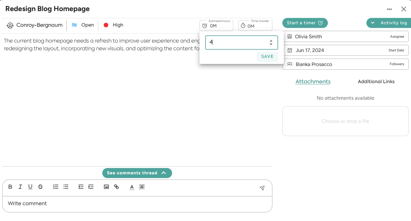 Allocate time to tasks effortlessly using BizMan. Set estimates and compare them with actual tracked time to enhance project planning. Stay on top of project timelines, meet deadlines, and deliver exceptional results.